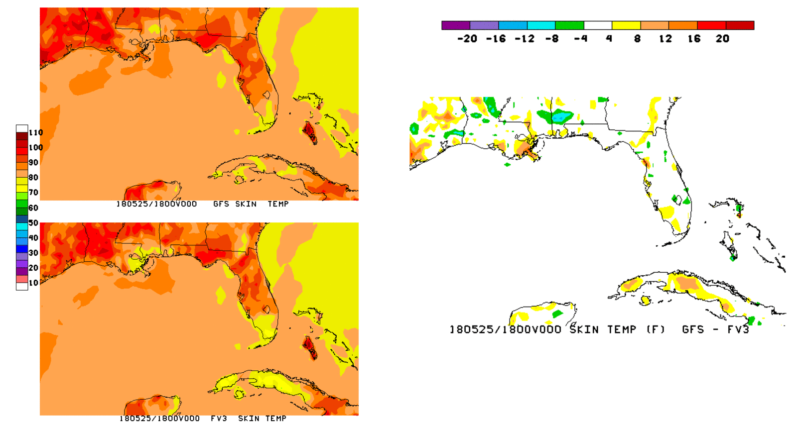 Thanks, Jack, for those nice examples.   I'm pleased to report that EMC has corrected the SST problem as of the 18z cycle today (May 25).   The attached comparisons of skin temp (SST over water) between the GFS and FV3GFS at 12 and 18z demonstrate that the large differences are gone in the 18z cycle.