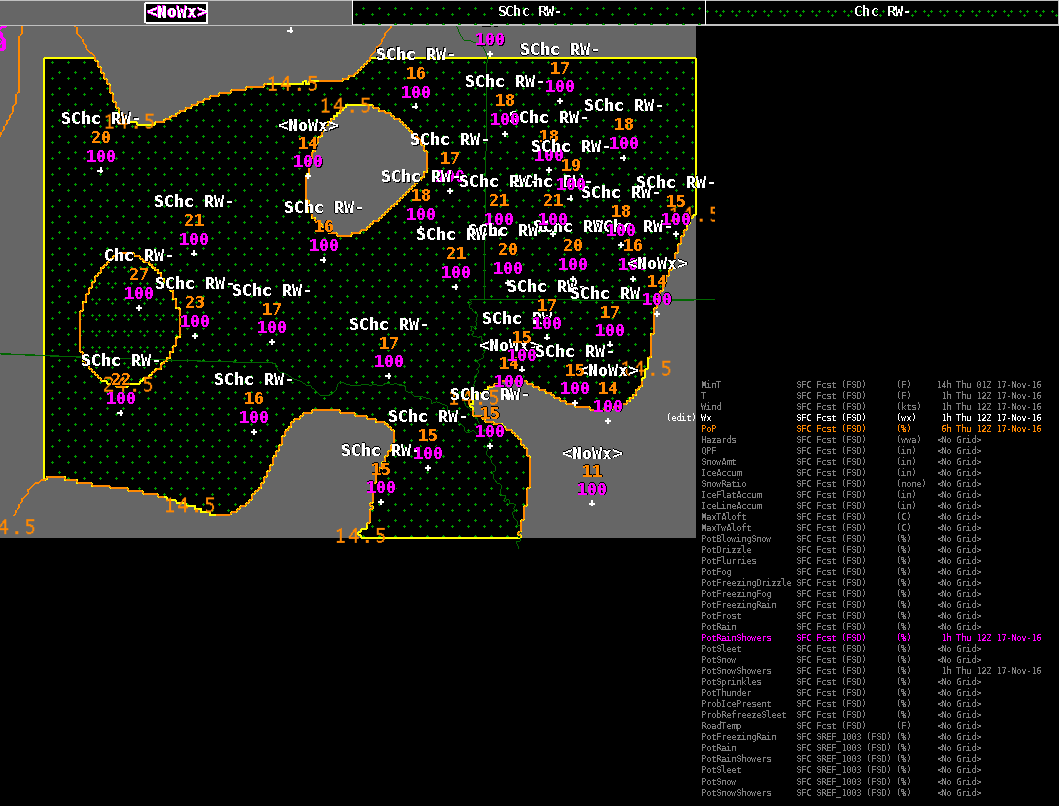 the subsequent 5-hour grid had the Wx categories (SChc and Chc)